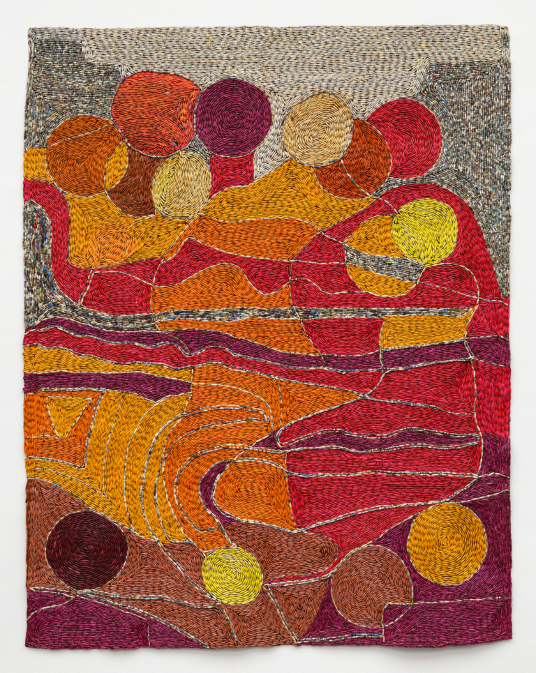 He makes intricate works from post-consumer paper that he rolls into beads, sewing them onto bark cloth supports in tapestry-like assemblages. Up close, the beads offer glimpses, between folds, of their past lives—as vintage posters, pages from wig sales pamphlets, and outdated textbooks, among other things. His distinctive method requires the involvement of members of his community, whom he has trained and employed since the early 1990s. Gateja envisions artists as agents for social, political, and environmental transformation, and art-making as an act of ecological and spiritual repair. Disrupting conventional distinctions between figuration and abstraction, and two-dimensional work and sculpture, the resulting swirling, mosaic-like pieces instead draw affective connections between people and their surroundings. Gateja lives in Kampala, Uganda.