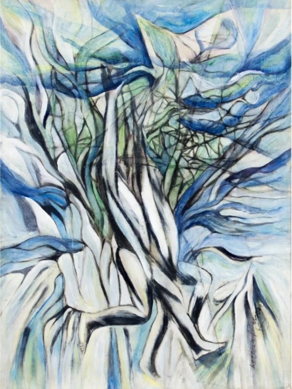 From vivid to muted sky blues and hints of green.  Human life and plant life intertwine in Theresa Musoke’s Dancing with the Trees. In the mixed media piece, human beings become one with the plants. It’s as though their heads are sprouting with plants whose leaves whorl upward in the same synchronous movement as their hands. The plants crisscross and intertwine around their head and arms to become one. A camouflaging act? Deep blue streaks like narrow streams flow outwards from their torsos. These ‘streams’, as if leaving trails behind them, are surrounded by lighter shades of blue.  There are some scant dabs of yellow across the canvas that seem to highlight movement in both life forms.